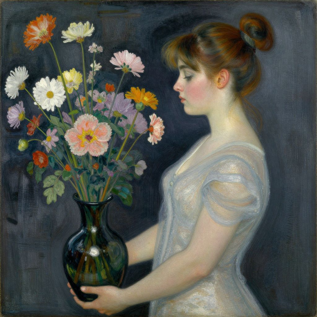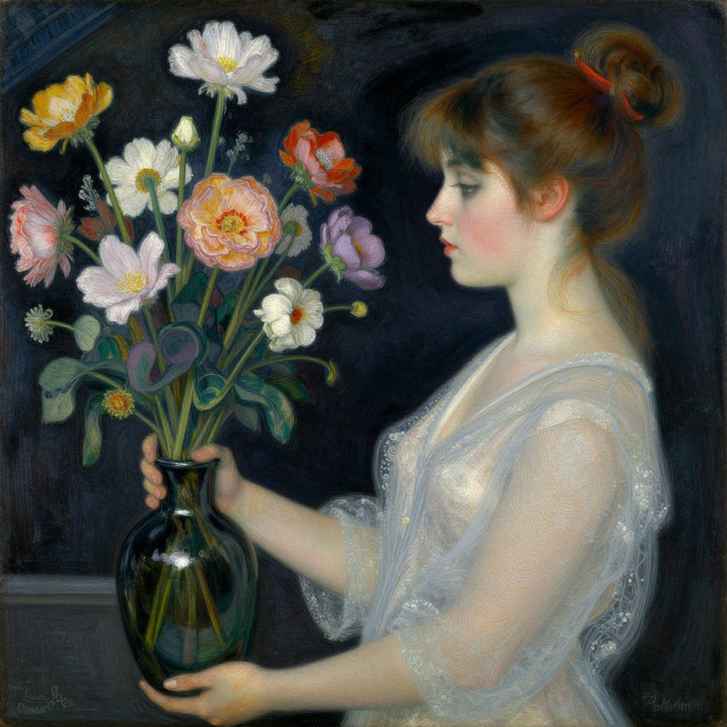Painting of a fair-skinned woman with brown hair in a bun, wearing a sheer, sparkly dress, holding a glass vase of colorful flowers