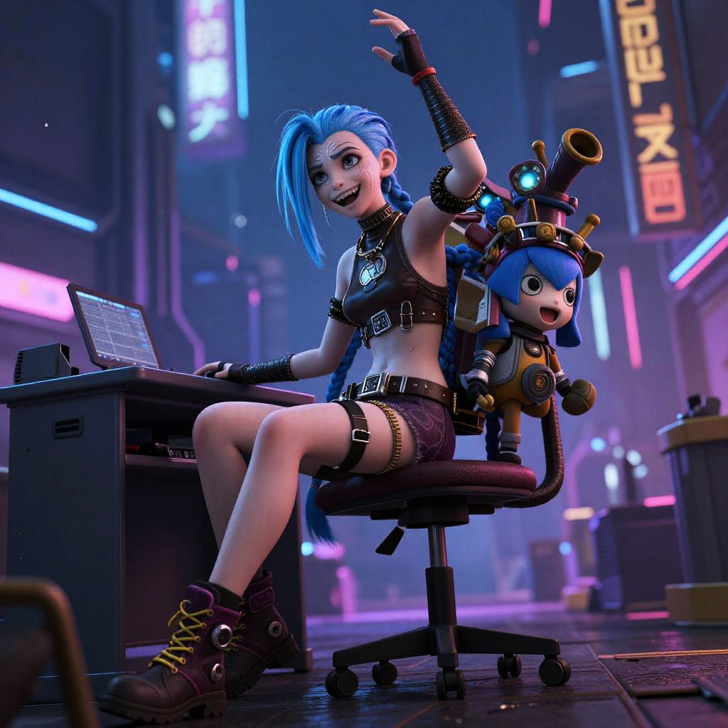 Unparalleled masterpiece, ultra realistic 8k CG, perfect artwork, masterpiece, full body, from below, on street, outdoor, cyberpunk, night, nihonga, one hand up, sitting on desk, rpg on back, jinx, 1girl, small breasts, (crazy smile)