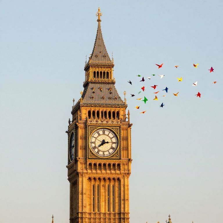 Clocktower bursts forth with a kaleidoscope of origami birds at noon, transforming its timeless structure into a dynamic swarm of delicate, fluttering forms against a serene sky.