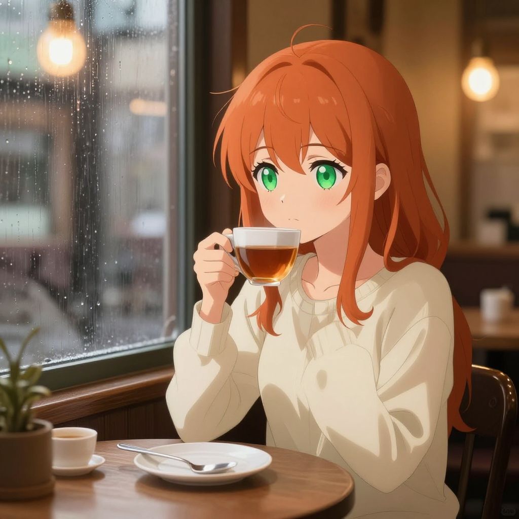 Anime girl with ginger hair and emerald green eyes seated at a vintage cafe, sipping tea beside a rainy window, reflections on the glass, cozy and nostalgic mood, detailed background with warm lights and wooden textures, soft pastel color palette