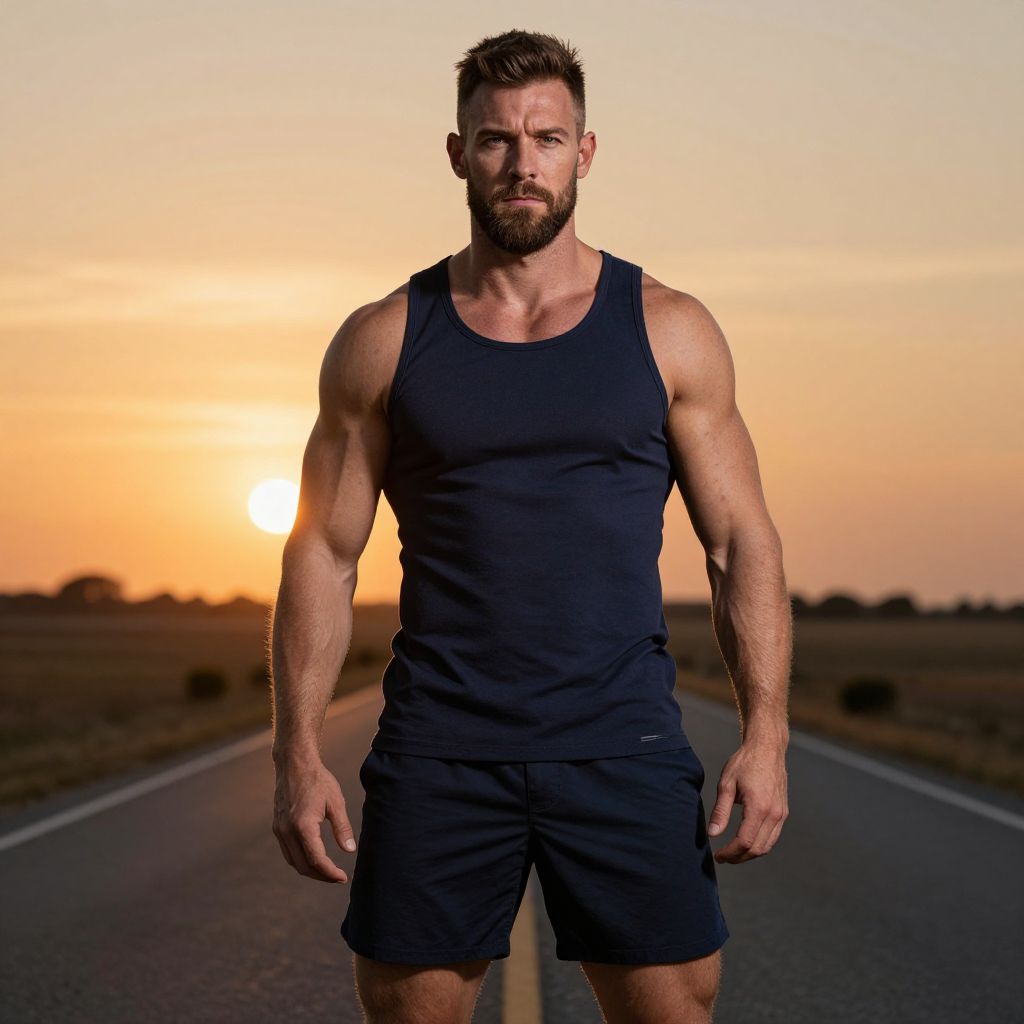 Photograph of a muscular, bearded man with short brown hair standing on a road at sunset. He's wearing a dark blue tank top and matching shorts, showcasing his toned arms and chest. The sun is low in the background, casting a warm, orange glow across the scene. He has a serious expression and is centered in the frame.