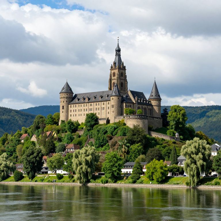 Schonburg Castle and the Church of Our Lady in Oberwesel stand majestically atop a verdant hill, surrounded by lush greenery and reflecting serenely in the calm waters of the Rhine, with distant mountains and billowing clouds framing the picturesque scene.