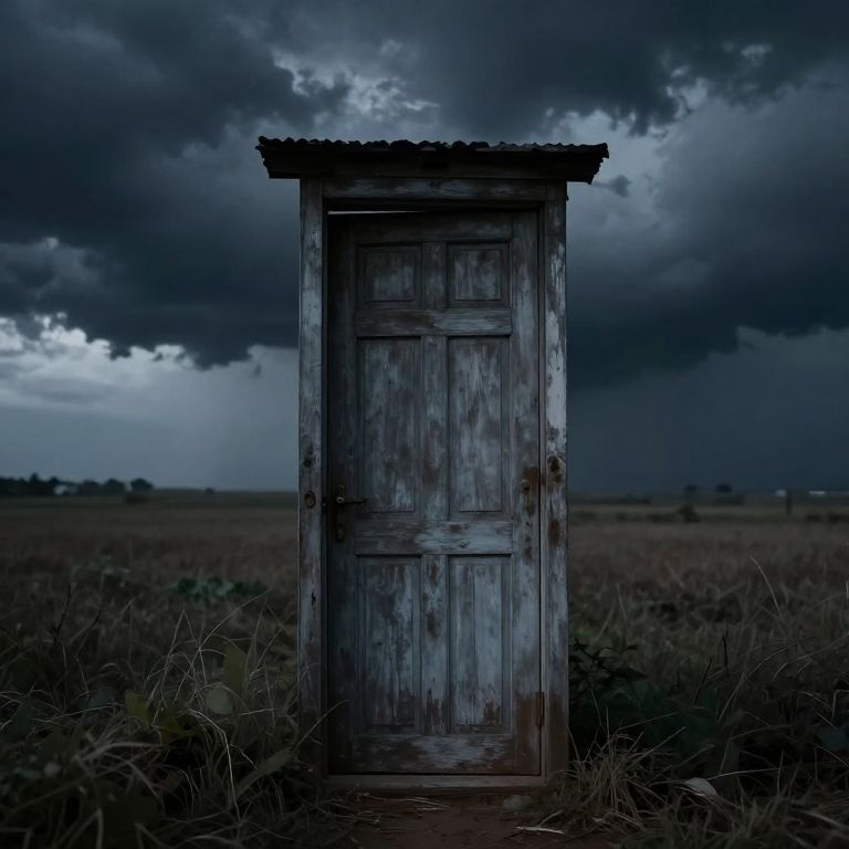 Photograph of a weathered, wooden outhouse set against a dark, stormy sky. The door is centered, featuring two vertical panels with visible grain and rust stains. The roof is small with a corrugated texture. The background shows a vast, grassy field under a dramatic, cloud-filled sky with shades of blue and gray, suggesting an impending storm. The outhouse stands alone, surrounded by tall, wild grasses, adding to the eerie, isolated atmosphere. The overall color palette is dark and moody, enhancing the sense of solitude and foreboding.