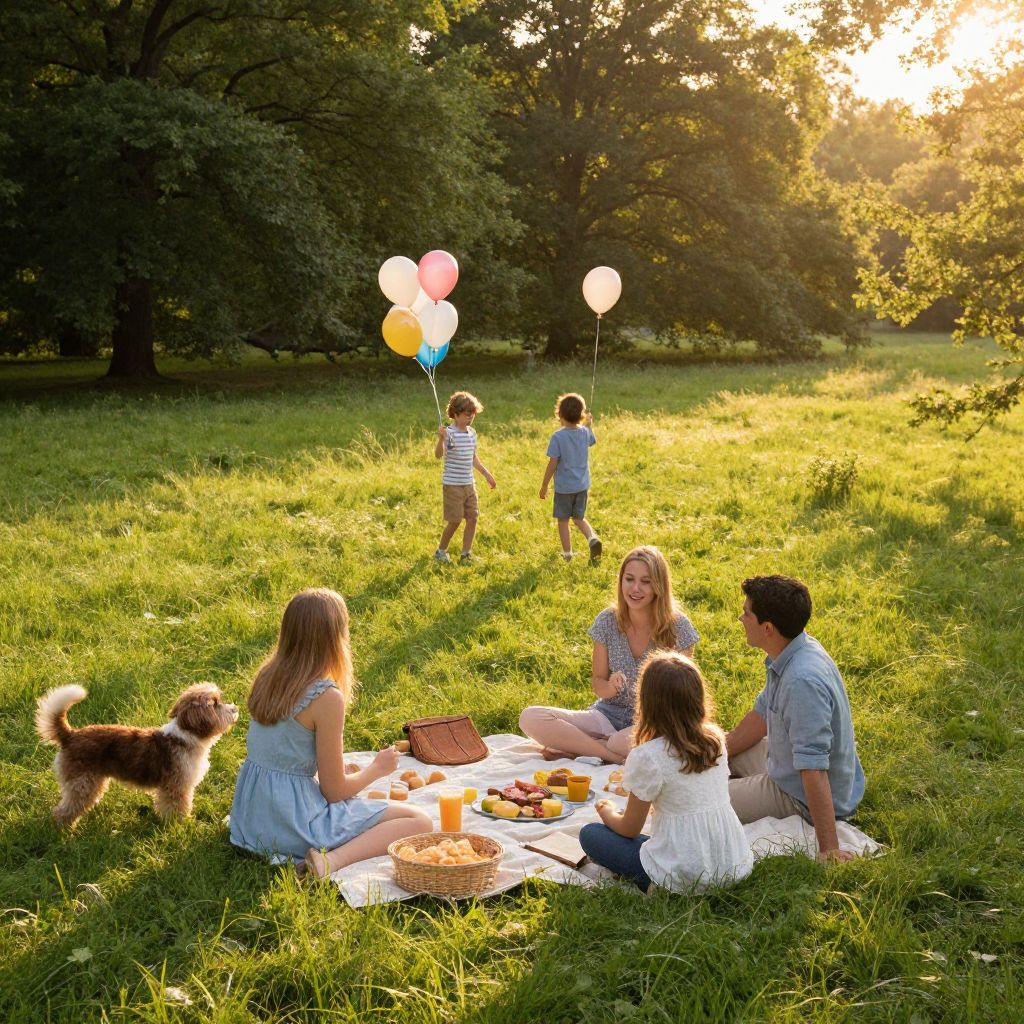 Fams family picnic scene in a lush green meadow during golden hour, children playing with balloons, parents sitting on a blanket with delicious food, friendly dogs nearby, soft sunlight filtering through the trees, painterly style with rich warm tones