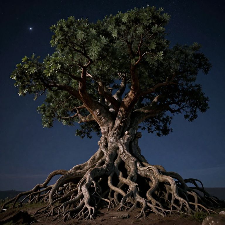 Photograph of a large, ancient tree with a thick, gnarled trunk and sprawling roots, set against a dark, starlit night sky. The tree's dense, green leaves are illuminated by a subtle light source, highlighting the intricate texture of the bark and roots. The background is a deep blue, with a small, bright star visible in the upper left corner. The image emphasizes the tree's powerful, almost mystical presence, with dramatic lighting and shadows enhancing its natural beauty.