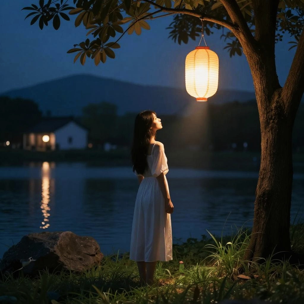 (masterpiece:1.2), best quality, realistic, Tyndall effect, lantern, 1girl, outdoors, scenery, bird, night, grass, solo, black hair, artist name, sky, standing, water, tree, rock, building, paper lantern