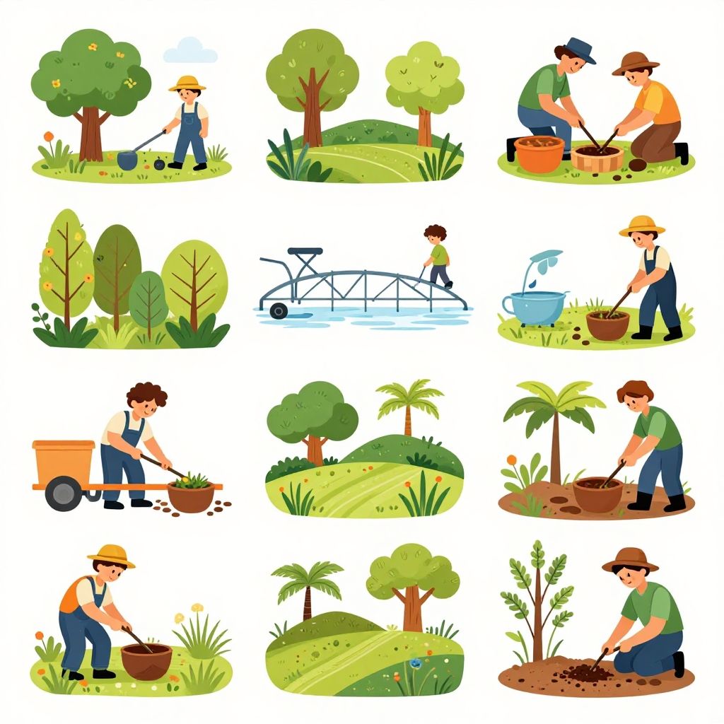 Illustration of a cartoon gardener performing various gardening tasks: planting, watering, digging, hauling, and mowing, in a colorful, sunny outdoor