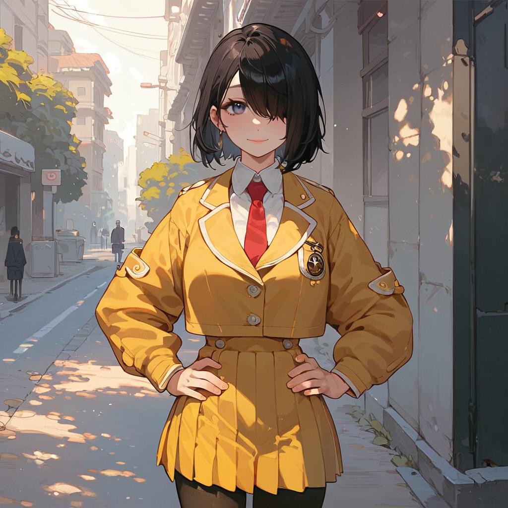 Score_9, score_8_up, score_7_up, source_anime, rukiakuchiki, rukia kuchiki, black hair, hair between eyes, purple eyes, short hair, skirt, bow, school uniform, jacket, blazer, grey jacket, indoors, classroom, smile, looking at viewer, cowboy shot, dutch angle