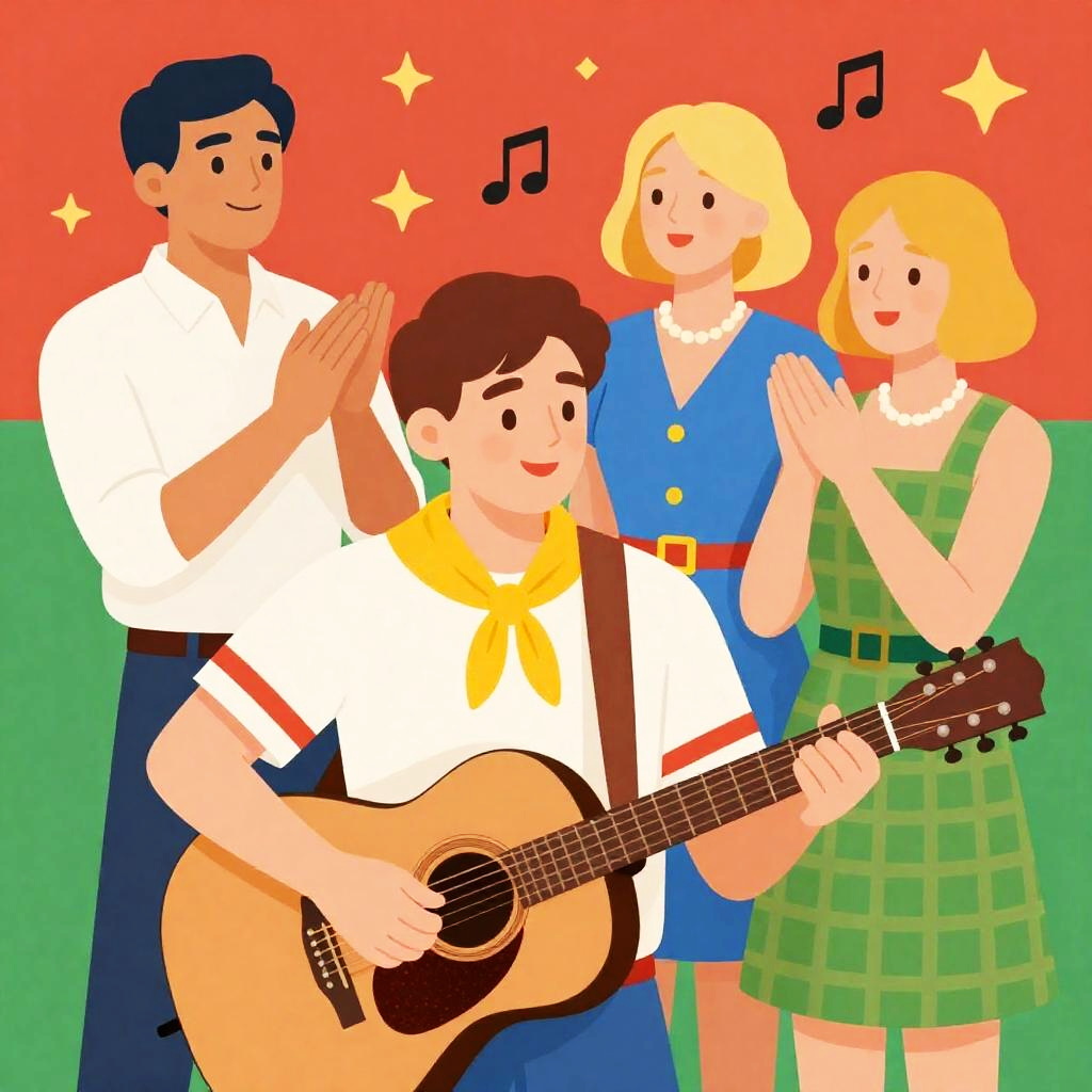 Colorful retro illustration of four people. Male in foreground playing acoustic guitar, smiling, wearing white shirt with red stripes and yellow scarf. Three people in background: man clapping, woman with blonde hair in blue dress, woman with short blonde hair in green plaid dress. Bright red and green background. Stars and musical notes above guitarist's head.