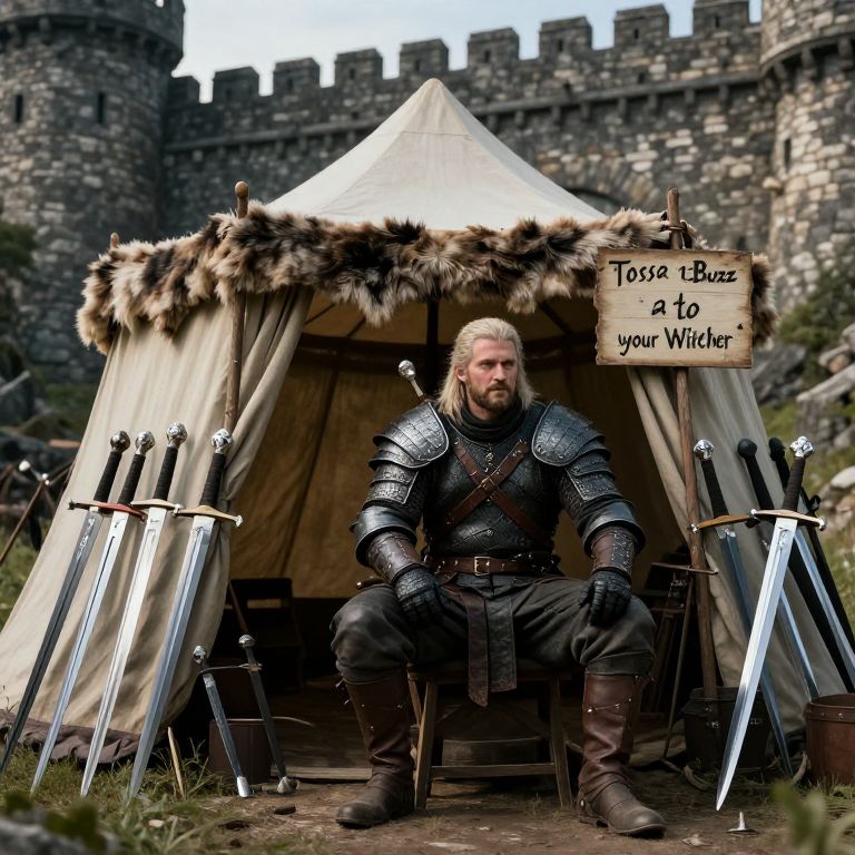 A merchant wearing medieval fantasy armor, he is sitting in front of a cloth and fur tent outside of a large fantasy city wall, in the tent are swords and blades for sale, holding sign with text that reads \"Toss a Buzz to your Witcher\", photorealistic, cinematic/ detailed digital hyper realistic intricate details, HDR, beautifully shot, sharp focus, 64 megapixels, high contrast, cinematic, atmospheric, moody