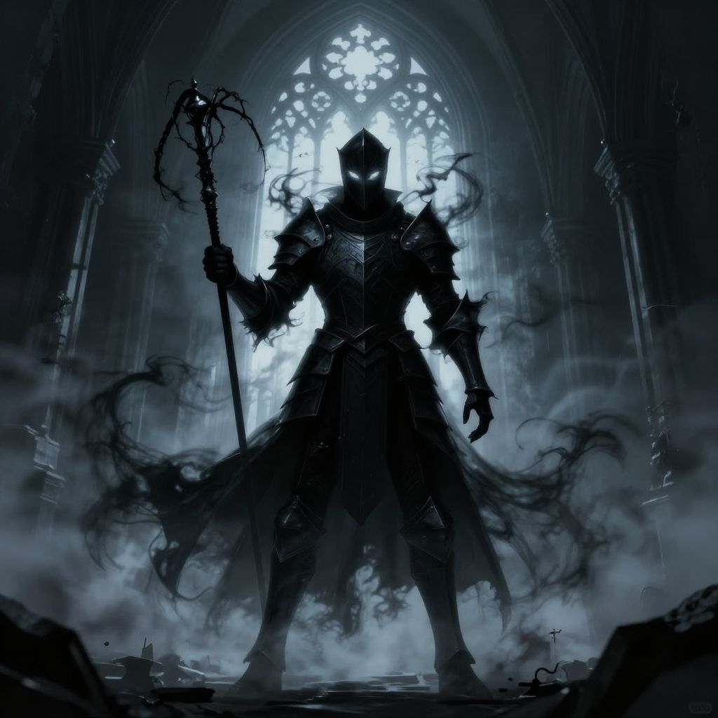 Digital artwork of a dark, armored figure with a glowing mask, holding a staff, standing in a misty, gothic cathedral.