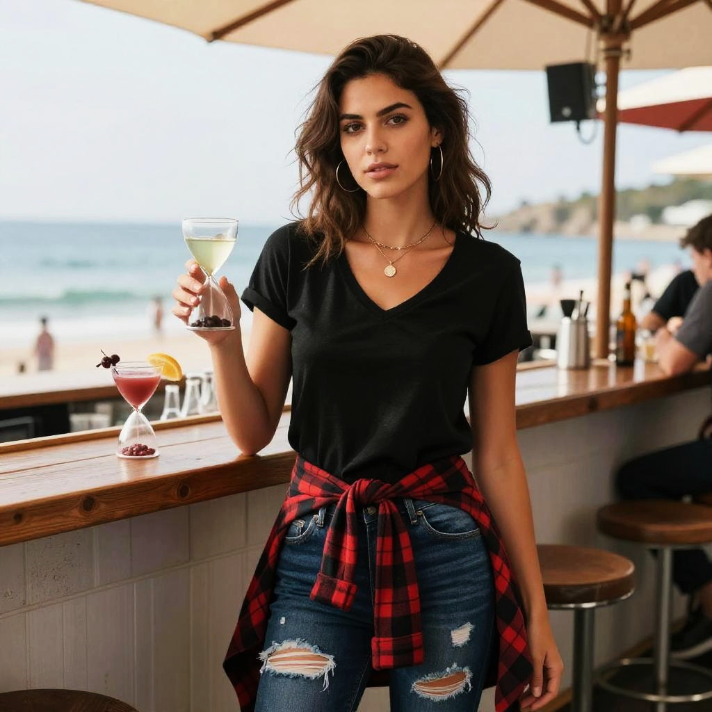 A slim woman in a casual chic outfit, wearing a loose white T-shirt tucked into faded mid-rise denim jeans, accessorized with a gold watch and delicate pendant necklace, stands at a Wine and Cheese Tasting at a Sunset Terrace, capturing the warm glow of the setting sun in a vibrant visual style. Sexy. Pretty face and beutiful eyes