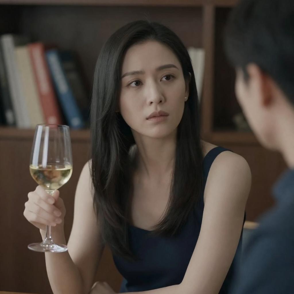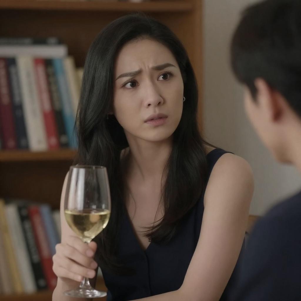 Photograph of a young woman with short brown hair, wearing a black sleeveless top, sitting at a wicker table with a blue and white checkered tablecloth. She has sunglasses on her head, looking to the side with a neutral expression. On the table are two glass pitchers with orange drinks, small glass bowls, and a black tablet. Background includes a blurred sandy shore. Another person's blurred face is in the foreground.