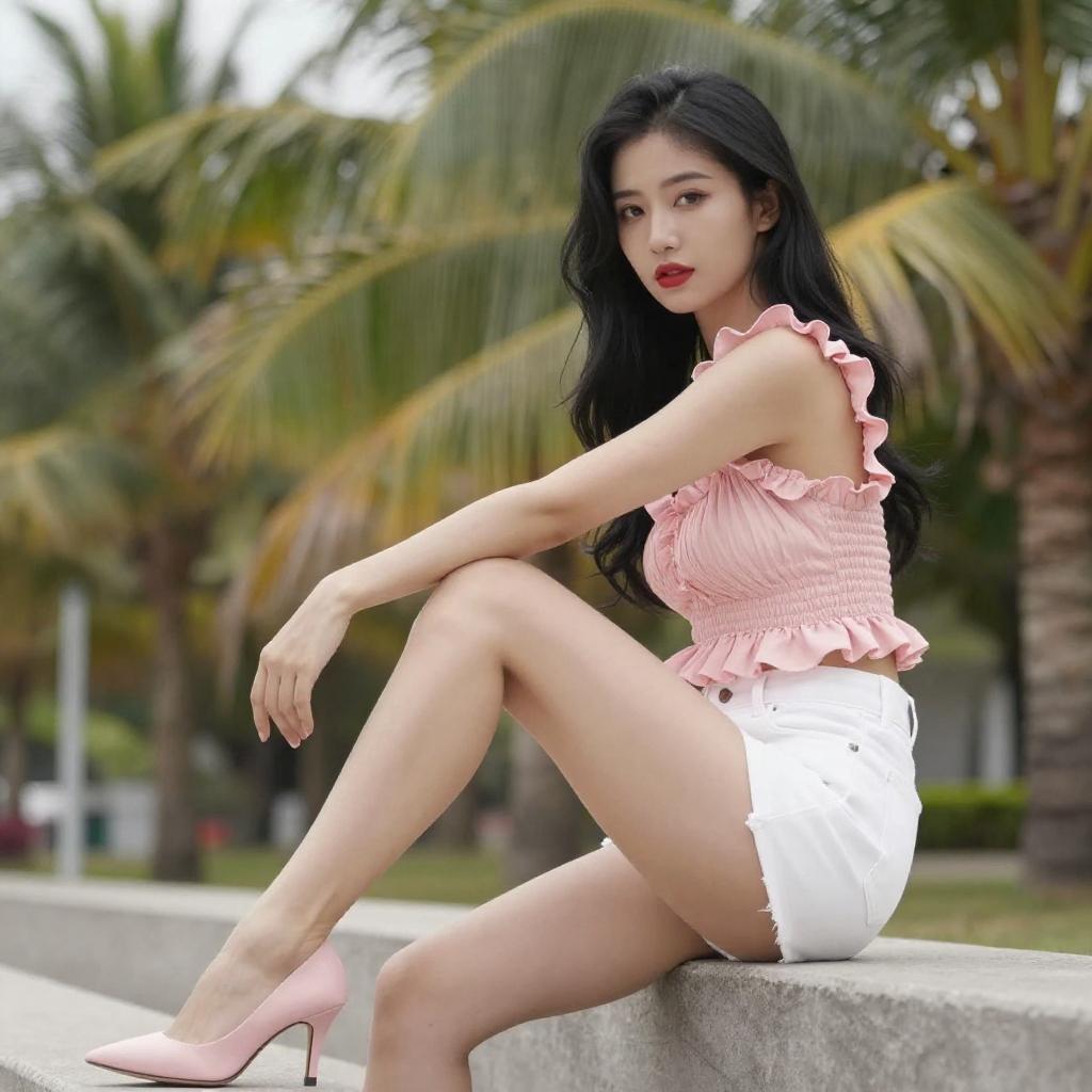 Photograph of a young woman with long black hair, fair skin, and red lipstick, sitting on a concrete ledge. She wears a pink, ruffled top and white high-waisted shorts, with pink high-heeled shoes. Her right arm rests on her knee, and she gazes at the camera. Green palm trees and a blurred background create a tropical setting.