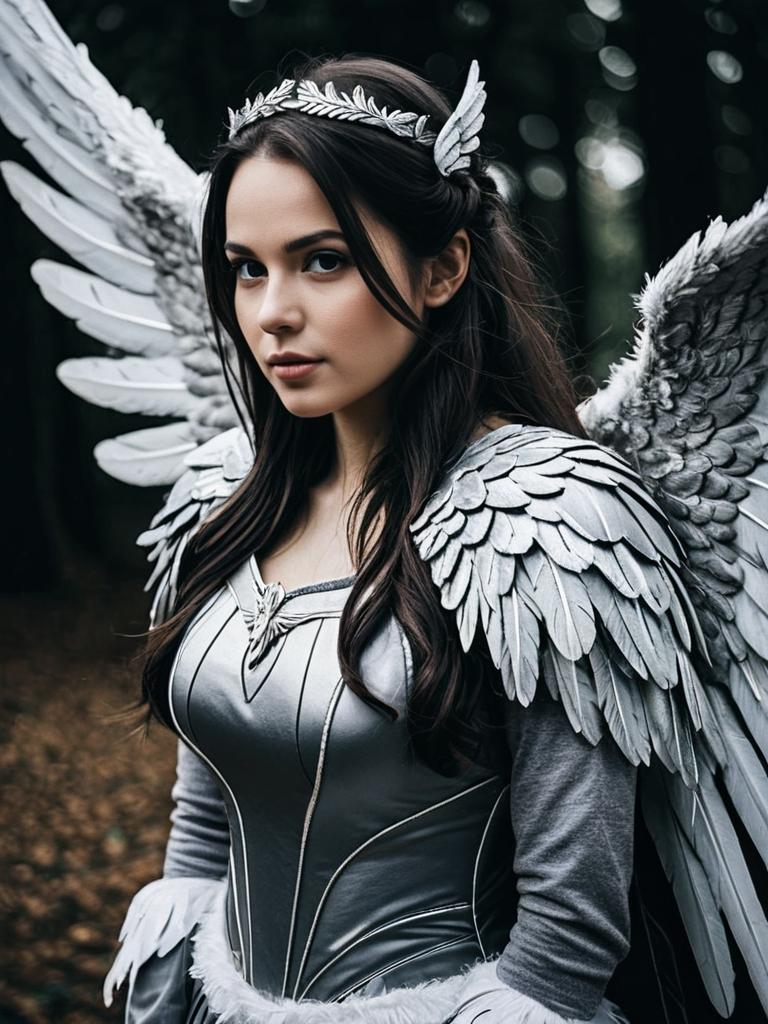 Woman in Grey Angel Wings Costume, photorealistic fantasy cosplay portrait, cinematic realism
