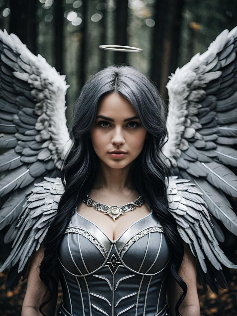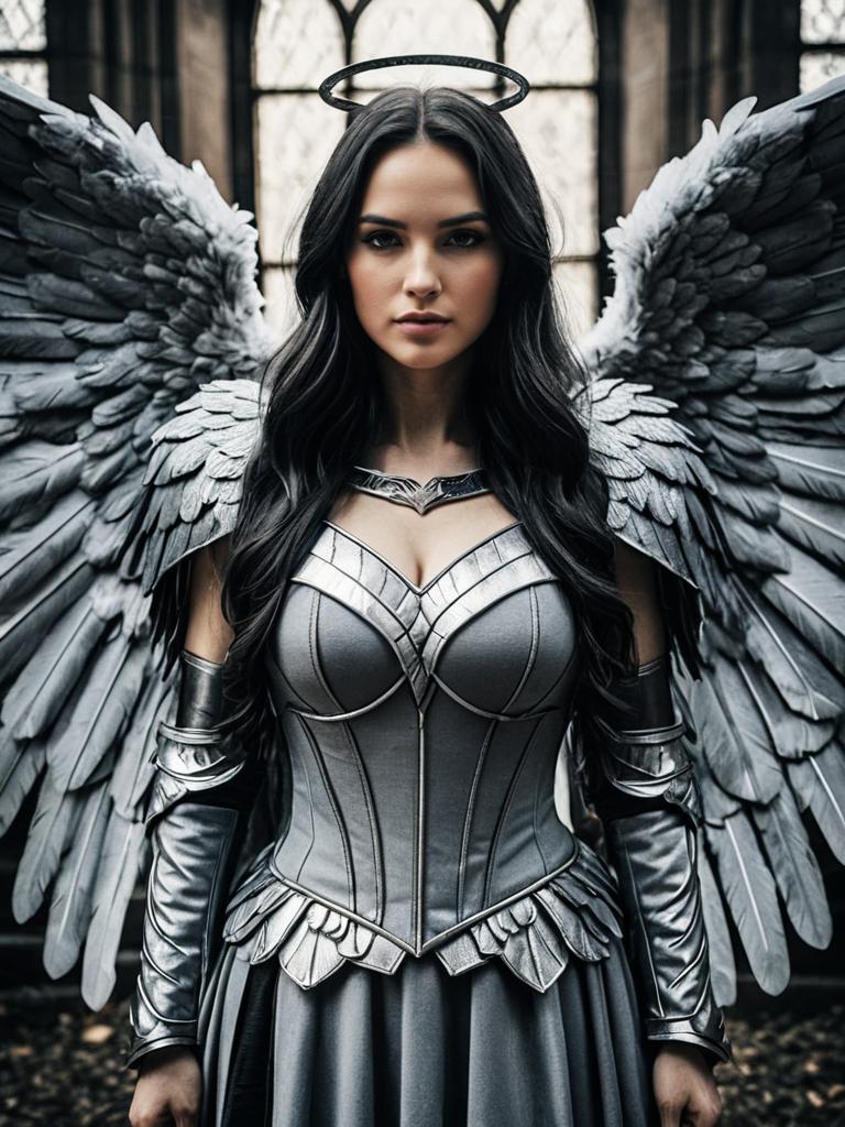 Photorealistic fantasy portrait of a young woman wearing a detailed grey angel wings costume. The outfit includes large feathered wings, armor-like bodice with sculpted designs, and matching arm accessories. She has long dark hair and a serious expression, set against a blurred architectural background.