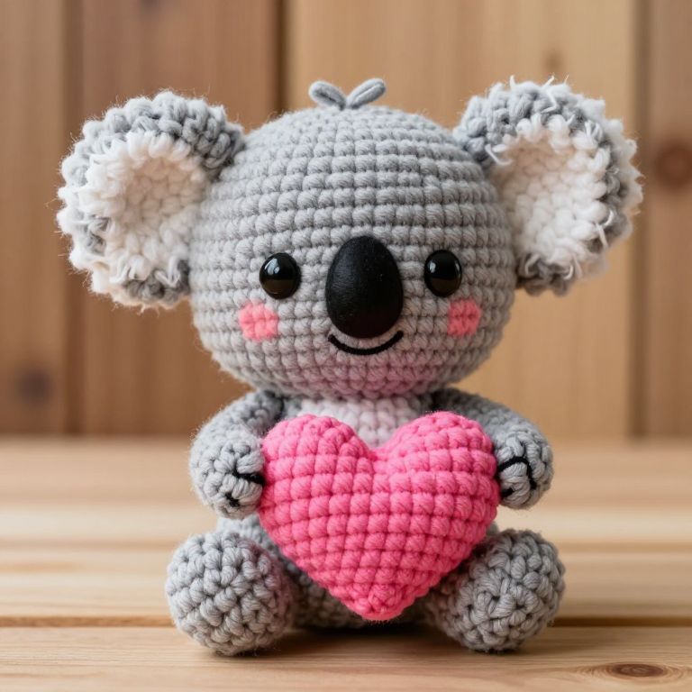 Photograph of a gray, crocheted teddy bear with pink bow, pink skirt, white muzzle, and black eyes, standing against a white