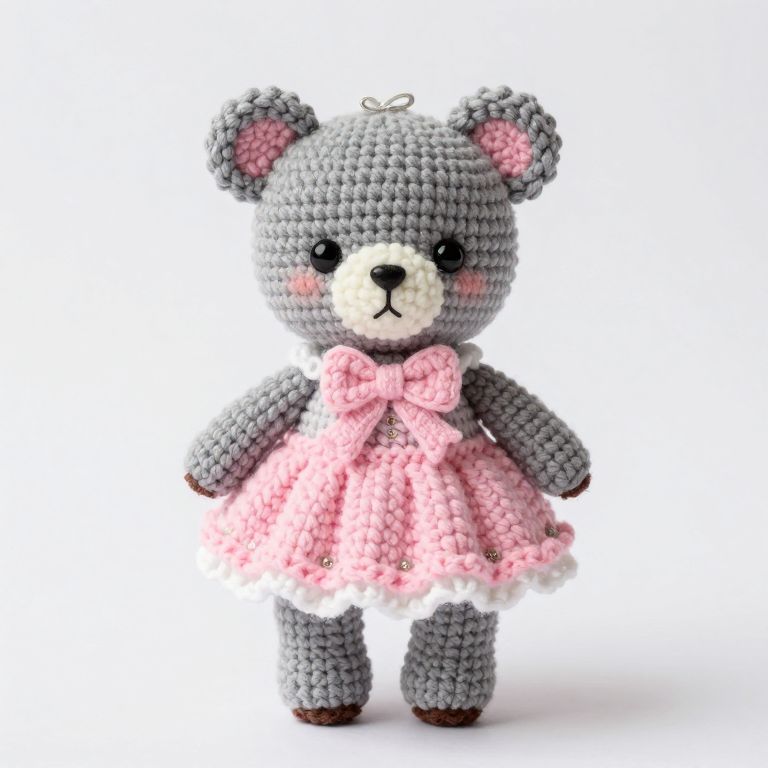 Cute amigurumi bear doll crafted with soft gray yarn, featuring a charming pink dress, bow, and accents, standing upright against a clean white background.