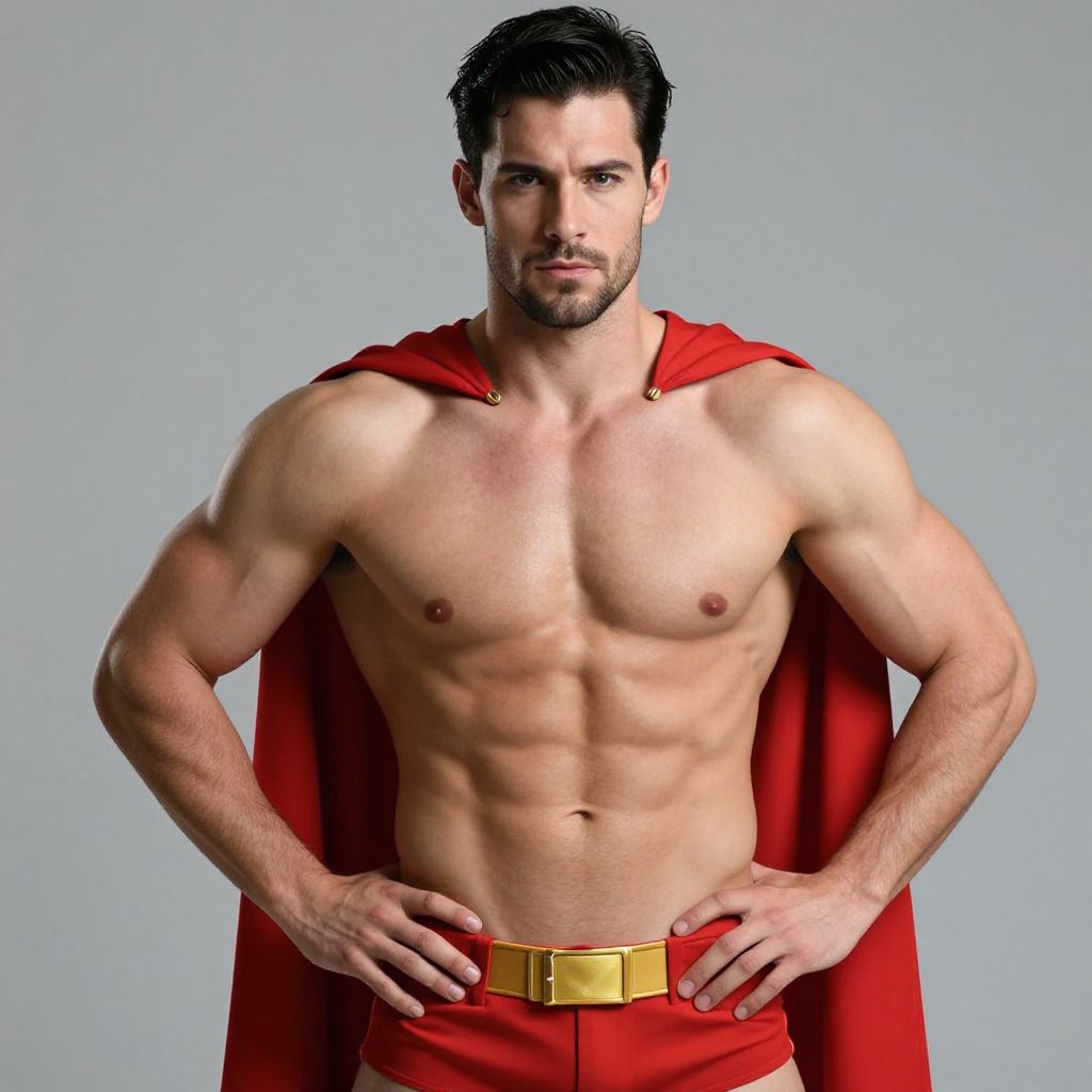Photograph of a muscular, light-skinned man with short, dark hair and a trimmed beard, standing against a plain gray background. He is wearing a red cape that drapes over his shoulders and red pants with a gold belt. His well-defined, bare chest and abs are prominently displayed, with his hands resting on his hips. His expression is confident and serious. The lighting highlights his muscular definition, casting soft shadows that accentuate his physique. The overall style is reminiscent of classic superhero imagery.