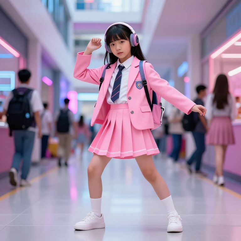 Photorealistic digital image of an Asian girl in a pink school uniform, white socks, and white sneakers, striking a confident pose in a brightly lit