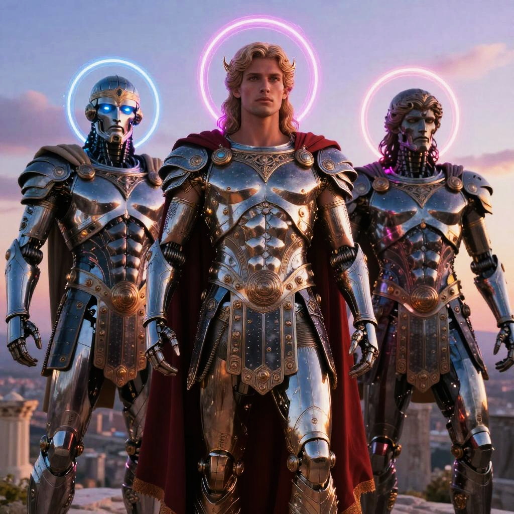 AI Greek gods reimagined as advanced robots, intricate metal designs with Greek armor motifs, glowing eyes and energy halos, standing on Mount Olympus under a neon sunset, sci-fi meets ancient mythology, highly detailed and vibrant.
