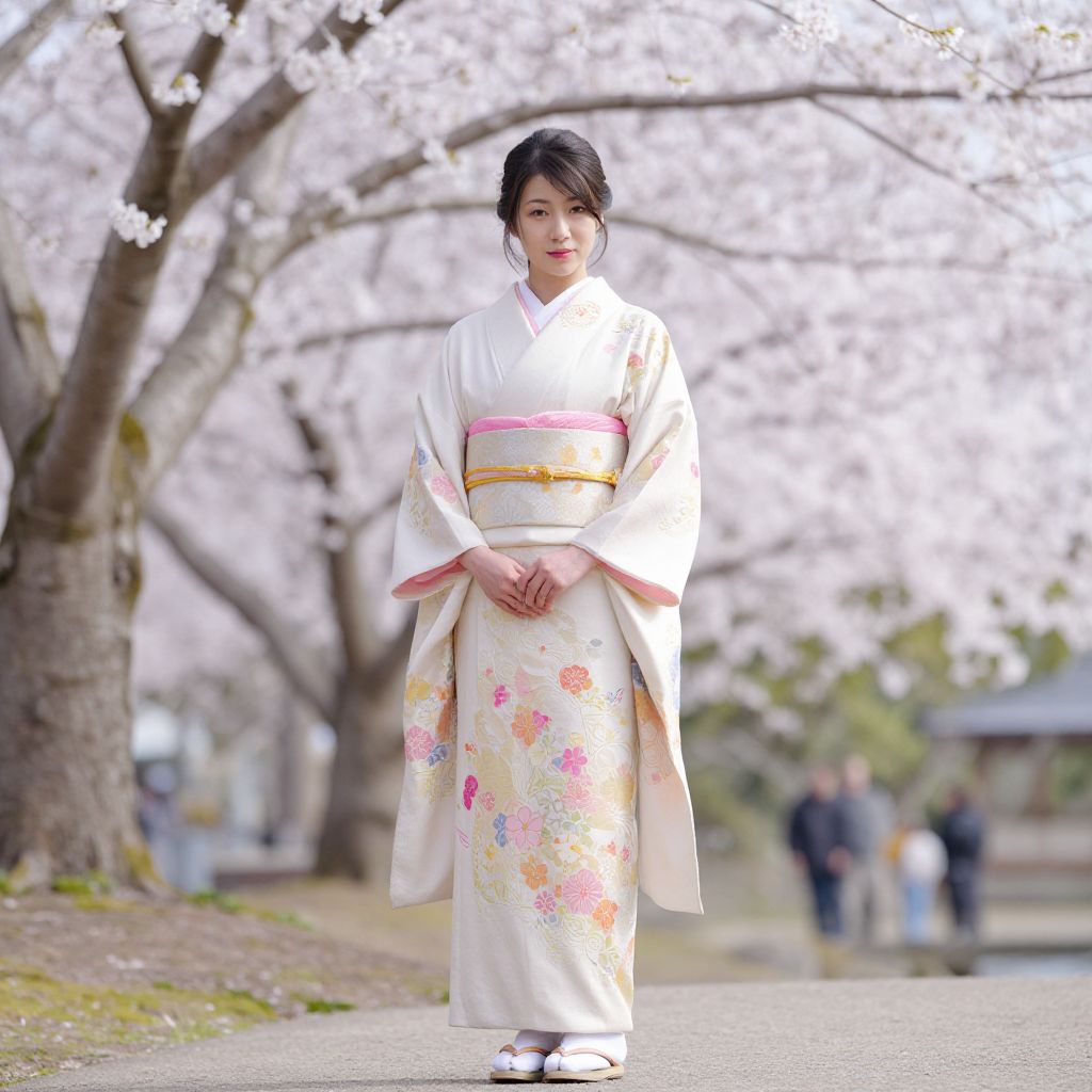 Whearing traditional Japanese kimono with intricate floral patterns, full-body portrait of a woman standing in a serene garden during cherry blossom season, soft pastel colors, detailed fabric texture and gentle sunlight filtering through trees.