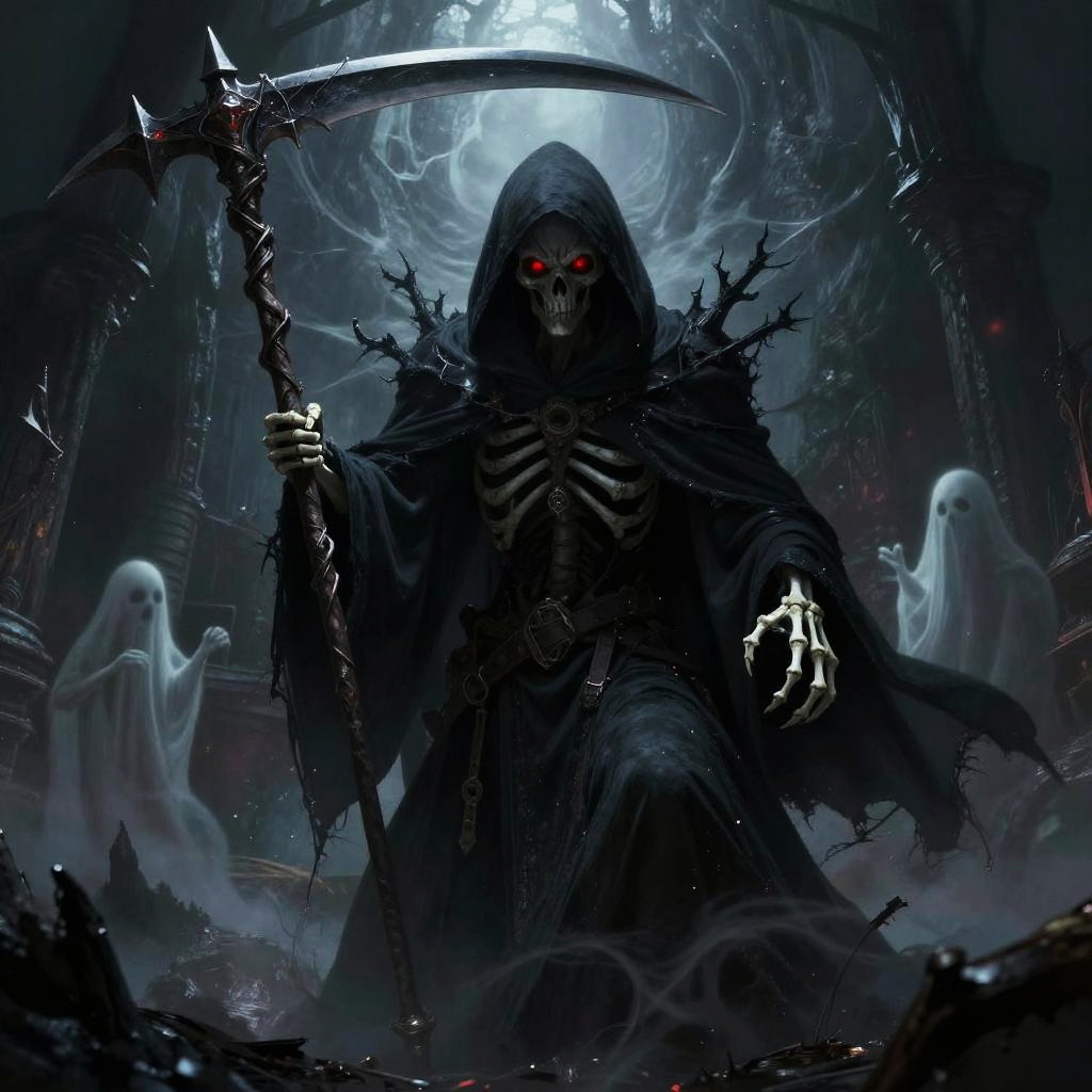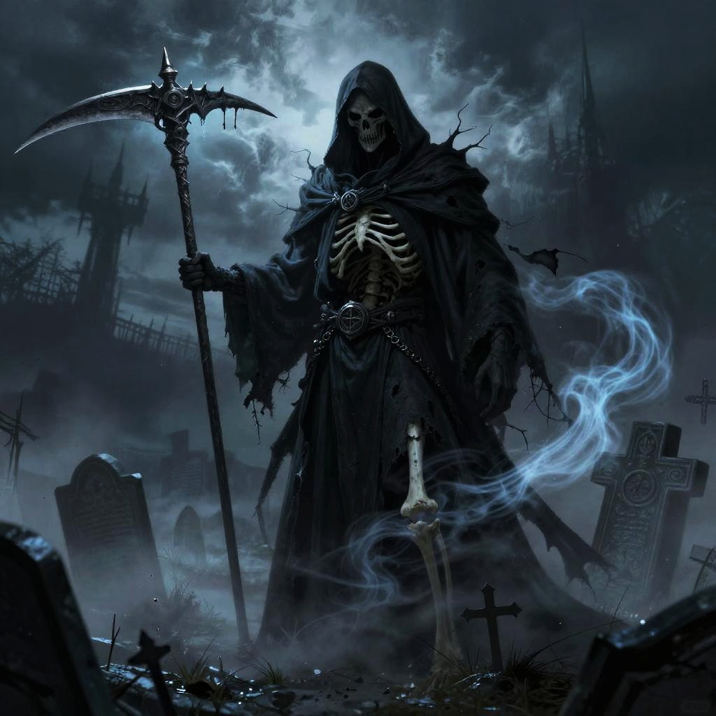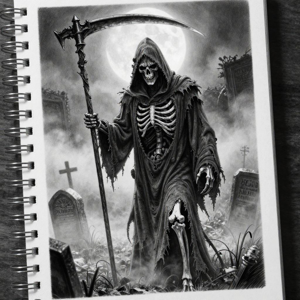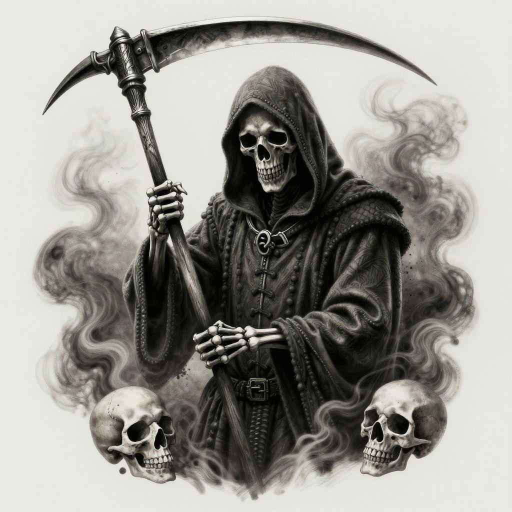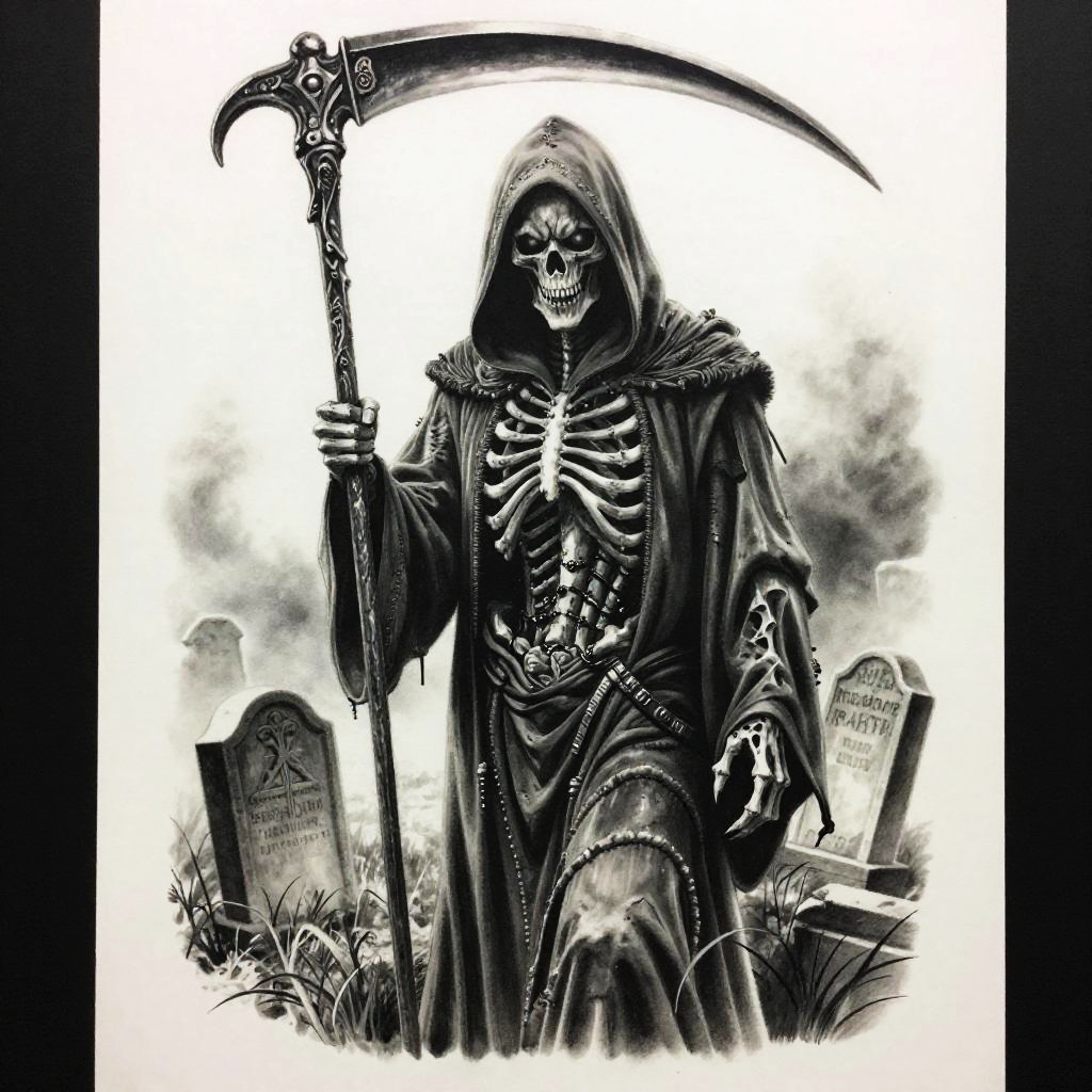 Realistic grim reaper tattoo drawing, full body image with flowing robes and sharp scythe, intricate bone structure, eerie glowing eyes, subtle background elements like gravestones and mist, photorealistic black and grey tattoo art, sharp contrasts