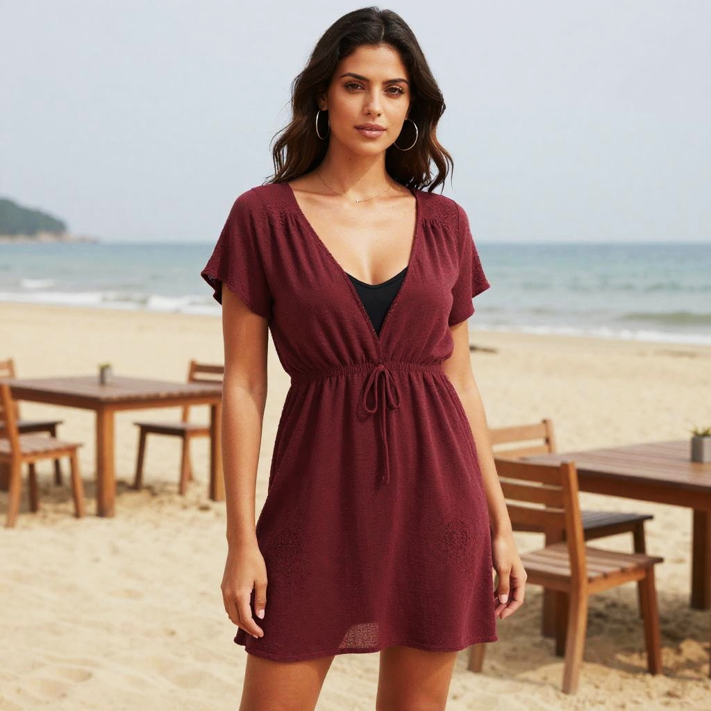 A woman in a casual bohemian maroon mini dress with a deep V-neckline and short sleeves, layered over a black camisole, standing on a sandy beach with seaside tables, drawn and quarterly style. Sexy. Pretty face and beutiful eyes