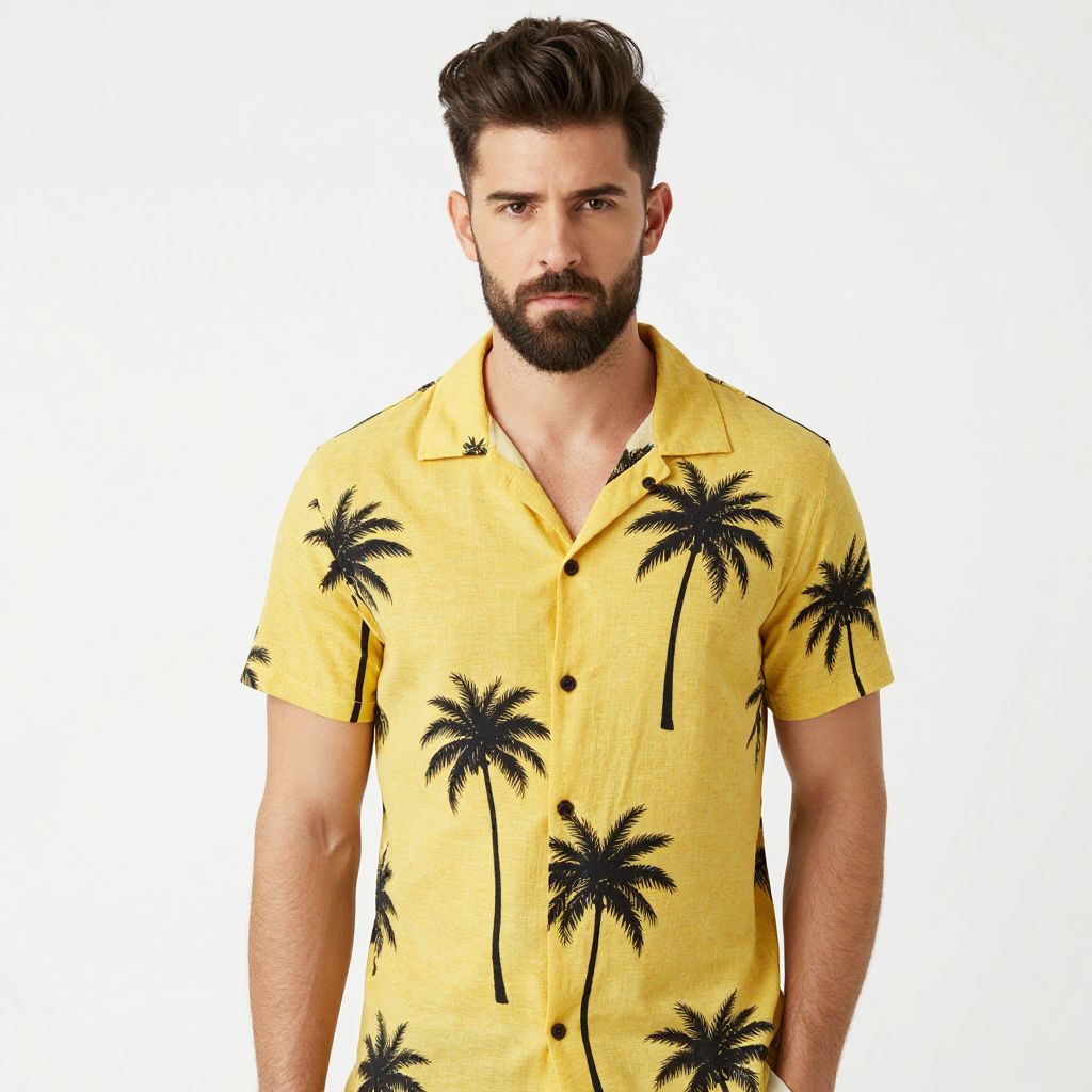 Photograph of a handsome, bearded man with dark brown hair styled upwards. He's wearing a bright yellow short-sleeve shirt with black palm tree patterns, buttoned up except for the top button. His right hand is in his pocket, and he's looking directly at the camera with a serious expression. The background is plain white, making him the clear focus. The style is casual and modern.