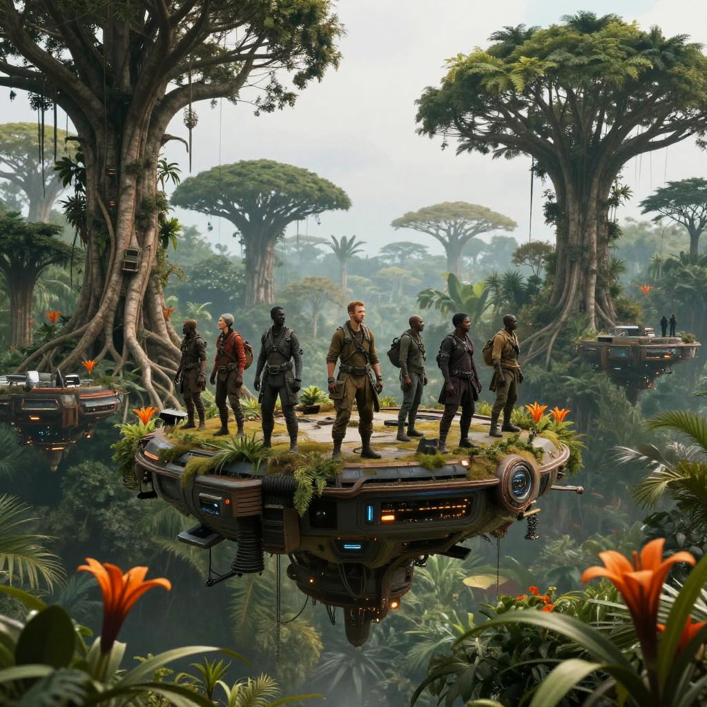 Realistic photo.Futuristic survival group of scavengers living in floating platforms, in the jungle of Congo, surrounded by genetically modified trees, roots, orange flowers, set in the distant future, transhumanistic costume design, very realistic, epic lighting, full body, photograph realistic photo
