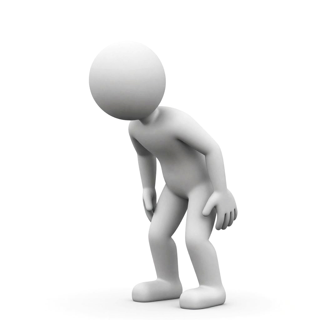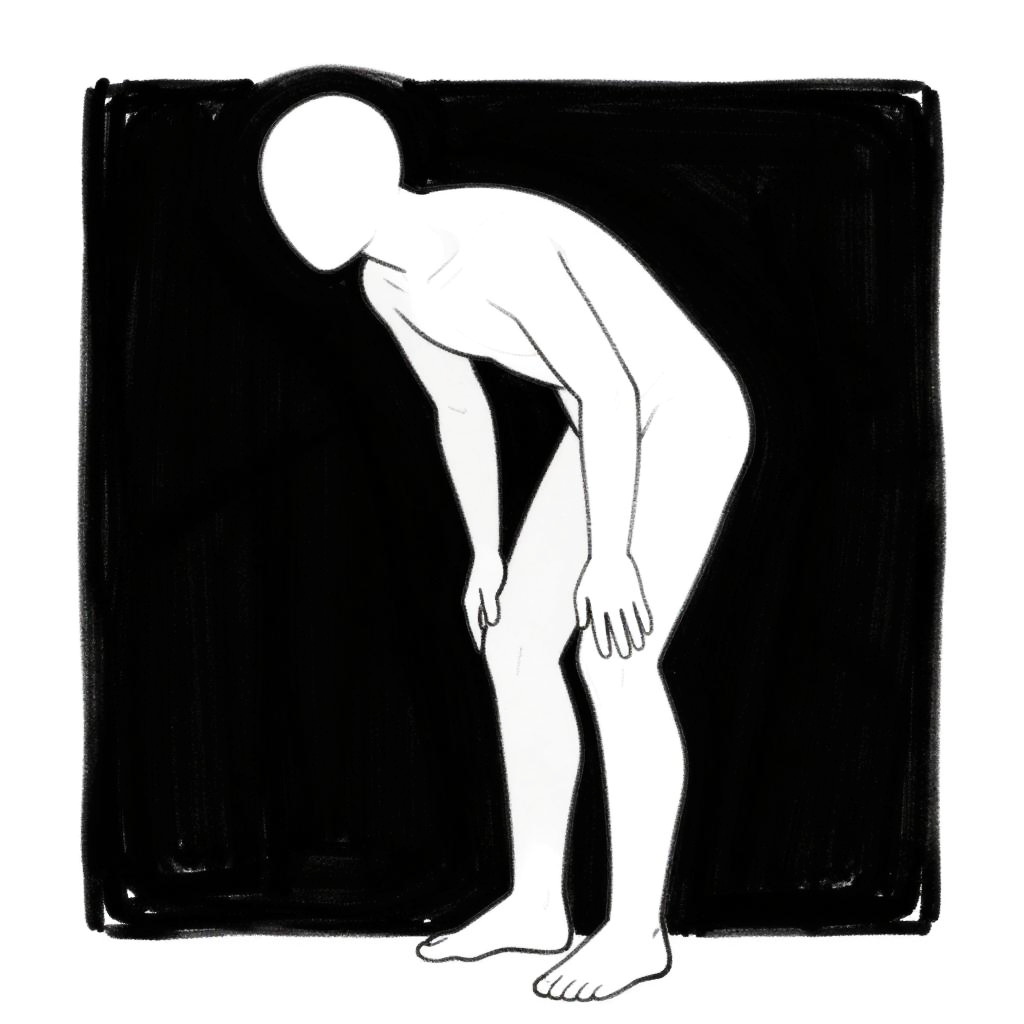 This is a digital drawing of a white, featureless humanoid figure standing in a bent-over position. The figure has a smooth, featureless head, and is depicted with a lean, slightly muscular build. Its arms are bent at the elbows, hands resting near its knees. The figure's legs are slightly apart, and it stands on tiptoes. The background is solid black, making the white figure stand out prominently.