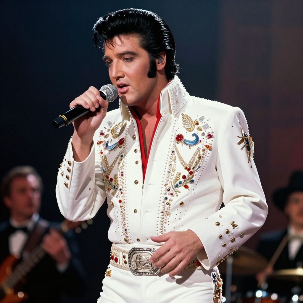 Masterpiece, best quality, extremely detailed, realistic, (high quality, sharp focus:1.4), photoshoot realistic, 4k, fine texture, hyperrealism, Best quality, ultra highres, Elvis Presley on stage
