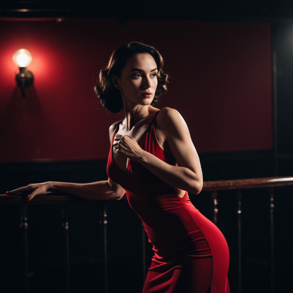 RAW photo, low key, cinematic composition, vintage burlesque style, photograph of a graceful ballerina, slender toned body, at a burlesque club, highly detailed, sultry pose, smoky room, dark lit, low key, alluring, seductive, muted color tones, black and dark with teal color popping out, rim light, silky slip dress, soft cinematic light, (perfect anatomy), (detailed eyebrows, beautiful eyes, realistic skin, detailed face:1.3), (focus on face, looking at viewer:1.1), dynamic pose, dynamic angle, photorealistic, photo realism, 8K UHD, absurdres, shot by professional DSLR camera, F1.4, 1/800s, ISO 100, sharp focus, depth of field, rule of thirds