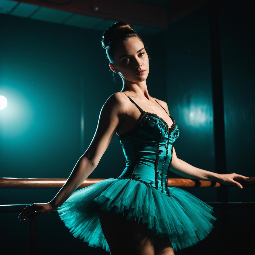 Portrait of a graceful ballerina with a slender toned body wearing a teal satin and tulle burlesque dress. The dancer poses seductively in a smoky, dimly lit room with low key cinematic lighting. Her hair is styled in a bun, and she leans on a ballet barre, highlighting her elegant posture. The photograph captures fine facial details with rim lighting and a muted dark color palette accented by teal tones.
