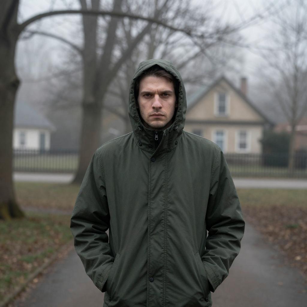 Photograph of a white man with light skin and short brown hair, wearing a green knit beanie and a tan, hooded winter jacket with straps. He stands in a snowy landscape with a dark, forested background. His expression is serious and contemplative. The lighting is cool, emphasizing the winter setting.