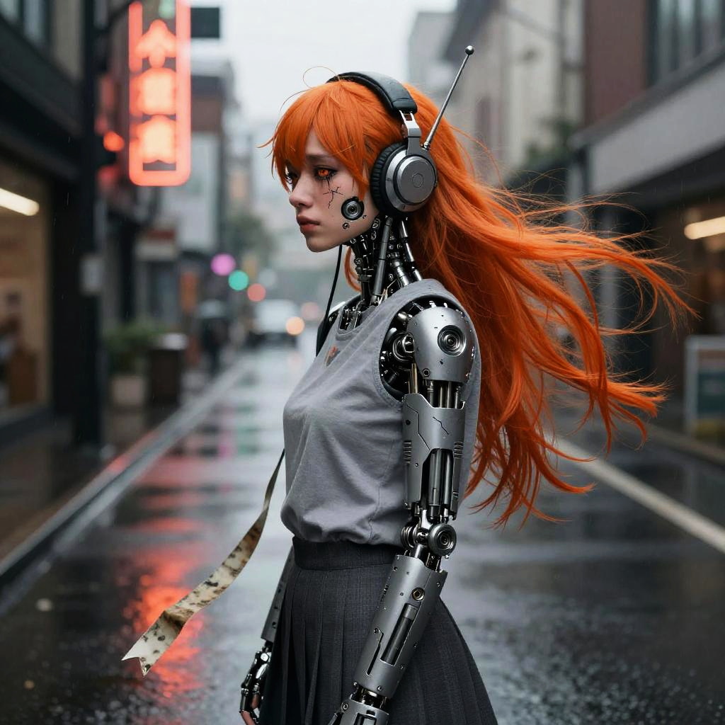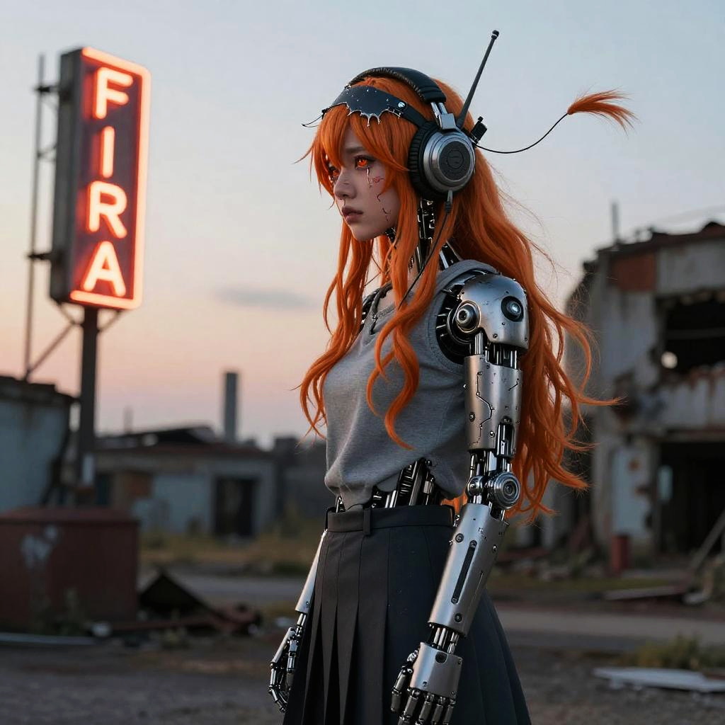Cowboy shot, adachi rei, android, orange hair, long hair, mechanical parts, cracked skin, detached sleeves, grey shirt, pleated skirt, headphones, radio antenna, floating hair, profile, messy hair, orange eyes, crying, tattoo, urban nightscape, melancholic_reverie, neon_backlit_haze, copper_goggles