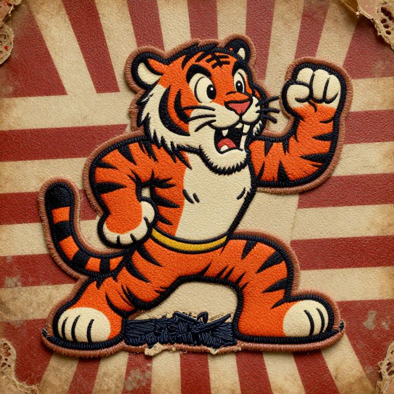 Vintage tiger mascot, vintage cartoon style with exaggerated features and dynamic pose, integrated on a distressed leather patch, surrounded by vintage stripes and worn textures, capturing the spirit of classic collegiate teams from the 1940s.