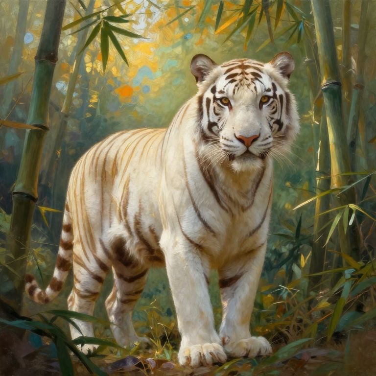An impressionistic oil painting style portrait captures a majestic white tiger amidst a serene bamboo forest. From a low-angle perspective, the powerful yet graceful form of the elusive creature emerges mysteriously from the dense foliage, focusing on its tawny fur. A soft, diffused light filters through the leaves, casting warm golden hues and subtle shadows across the animal. As the tiger turns to gaze directly at the viewer with an enigmatic expression, the background transforms into a vibrant abstraction of color and light, reflecting the ethereal beauty of this moment in nature. This unique blend of realism and artistic impressionism creates an evocative image that simultaneously conveys tranquility and untamed power.