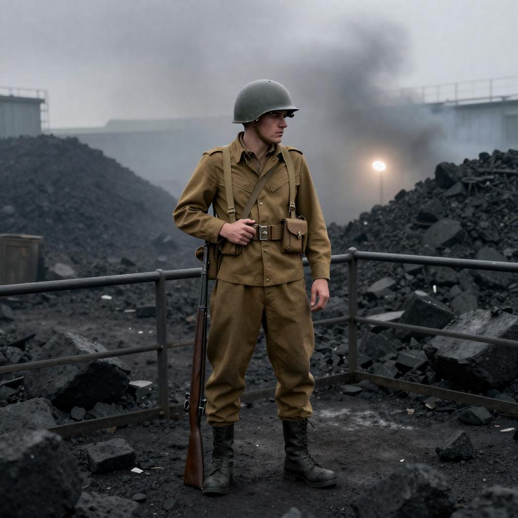 World War I Soldier in Industrial Coal Yard