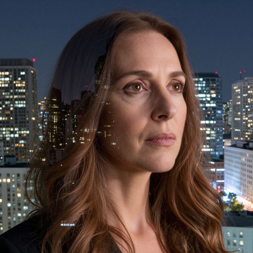 A photorealistic portrait photograph of a middle-aged woman with long, chestnut waves and warm hazel eyes set against an abstract nocturnal cityscape backdrop. Her enigmatic gaze conveys both weariness and resilience as she peers beyond the bustling metropolis to distant horizons. The delicate lines of her face contrast sharply with the angular skyscrapers, their glass surfaces refracting light in vibrant hues that cascade over her features like a living tapestry. This interplay of urban illumination and skin tones creates a soft aura around her head and shoulders, enhancing her ethereal presence amidst the city's chaos. In this double exposure, we capture a poignant moment of introspection, inviting viewers to reflect on the intricate bond between personal narratives and the ever-evolving human society.