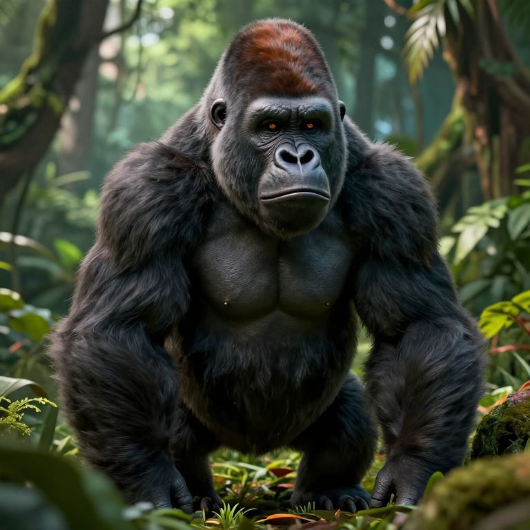 Photorealistic digital artwork of a powerful male gorilla with dark, dense fur and a reddish-brown crest on its head. The gorilla is crouching in a lush, dense forest, surrounded by green foliage and moss-covered trees. Its muscular build is prominently displayed, with broad shoulders and a strong chest. The gorilla's intense, dark eyes are focused forward, and its large, expressive face features a prominent brow ridge and flat nose. The background is softly blurred, highlighting the gorilla as the central subject. The lighting creates a natural, dappled effect through the forest canopy.