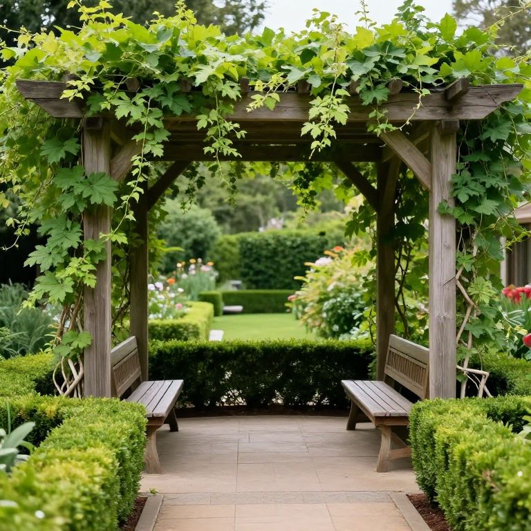 Lush green vines gracefully cascade over a wooden pergola, creating a serene retreat with two inviting benches nestled within a meticulously landscaped garden featuring neatly trimmed hedges and a paved pathway leading to its tranquil center.