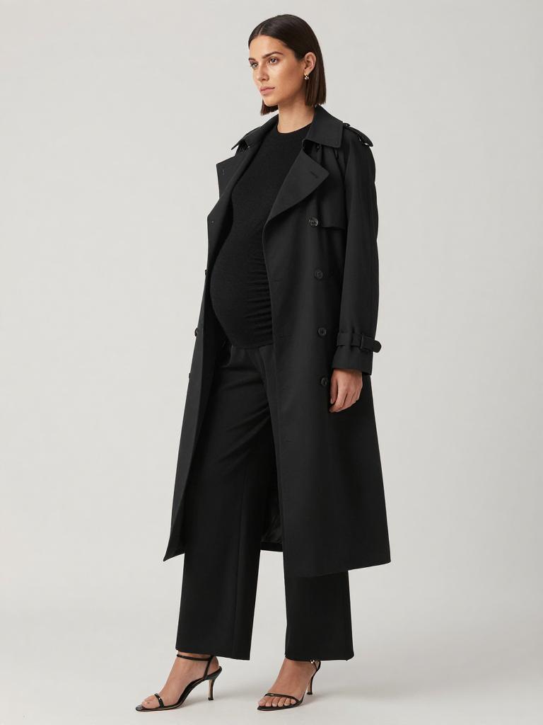 Pregnant fashion, woman with sleek straight lob tucked behind one ear and curvy athletic build with defined shoulders, in an all-black outfit, sleek monochrome style: soft black knit maternity top with ruching at the sides, tailored black trench coat cinched at the waist, flowy black palazzo trousers skimming the floor, black strappy heels with delicate ankle straps, casual-cool city style with relaxed tailoring, standing in plain white seamless backdrop studio background, high-end maternity fashion photography, soft flattering lighting, high resolution, ultra-detailed