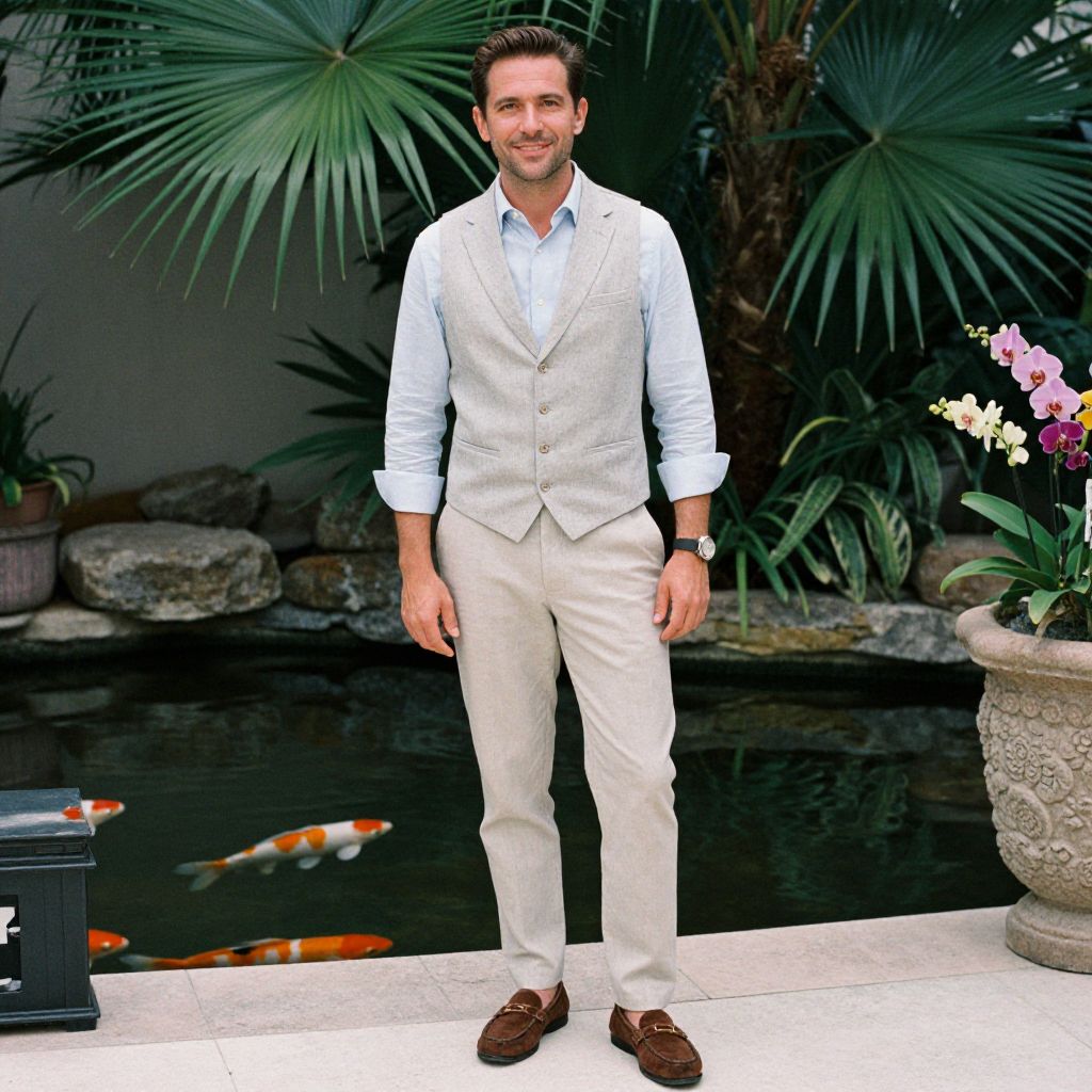A man, light grey linen waistcoat, pale blue button-up shirt, slim fit beige trousers, brown suede loafers, standing by a tranquil koi pond, lithographic film style, relaxed smile, surrounded by lush green palms and vibrant orchids. Man has masculine face and piercing eyes