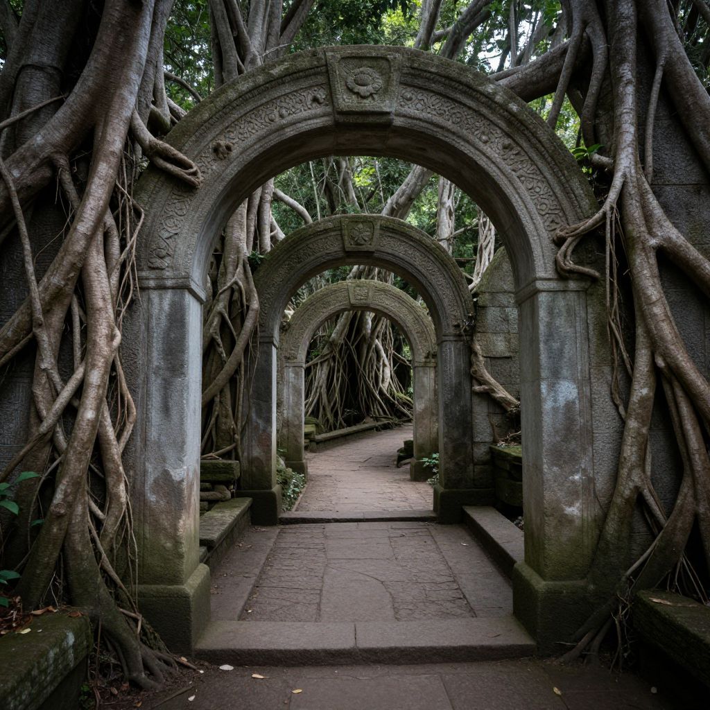 A mystical forest pathway winds through ancient stone archways, where gnarled tree roots intertwine with the architecture, creating a surreal blend of nature and human craftsmanship that defies conventional boundaries.