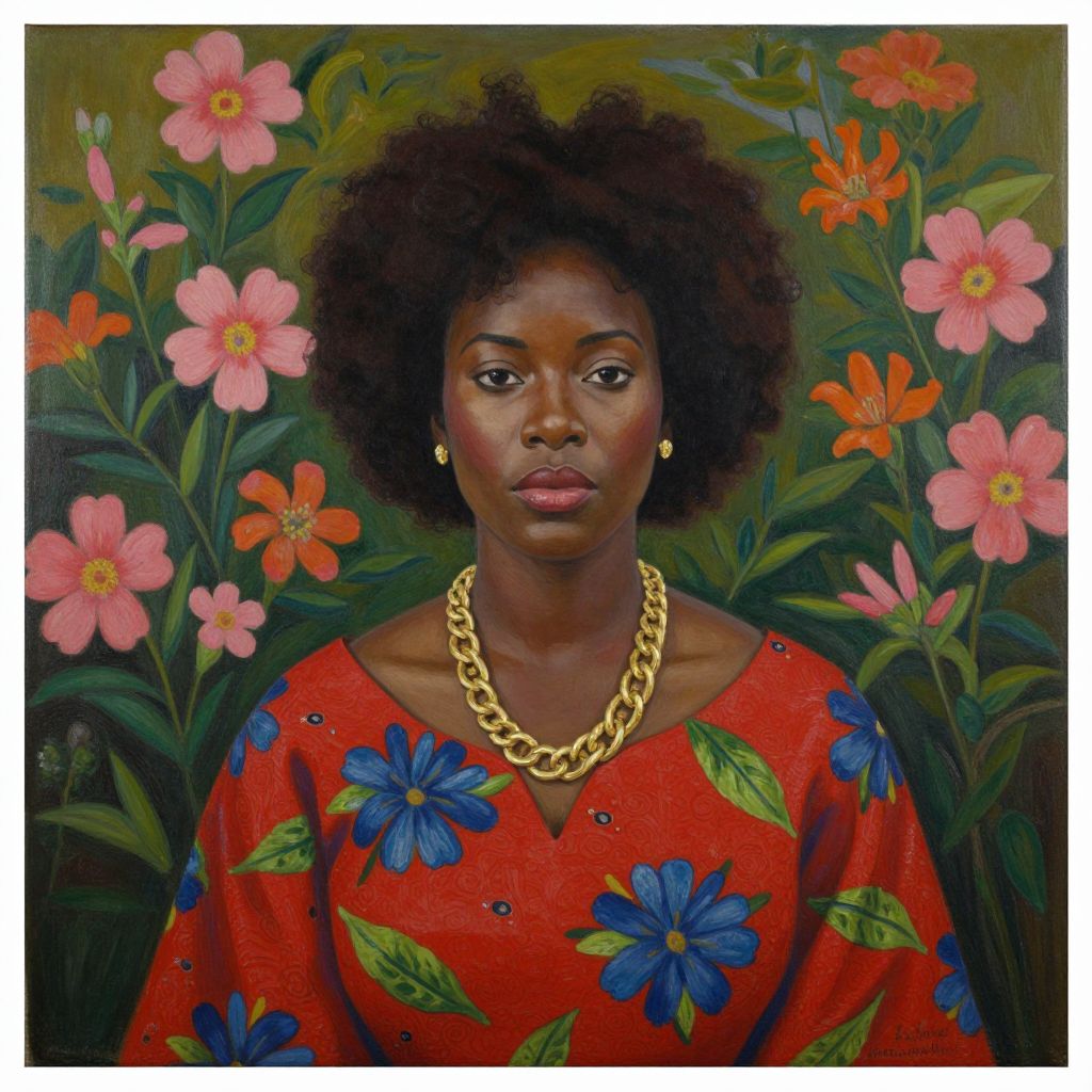 Photorealistic painting of a Black woman with dark skin and afro, wearing a red floral dress and gold necklace, surrounded by pink and orange flowers