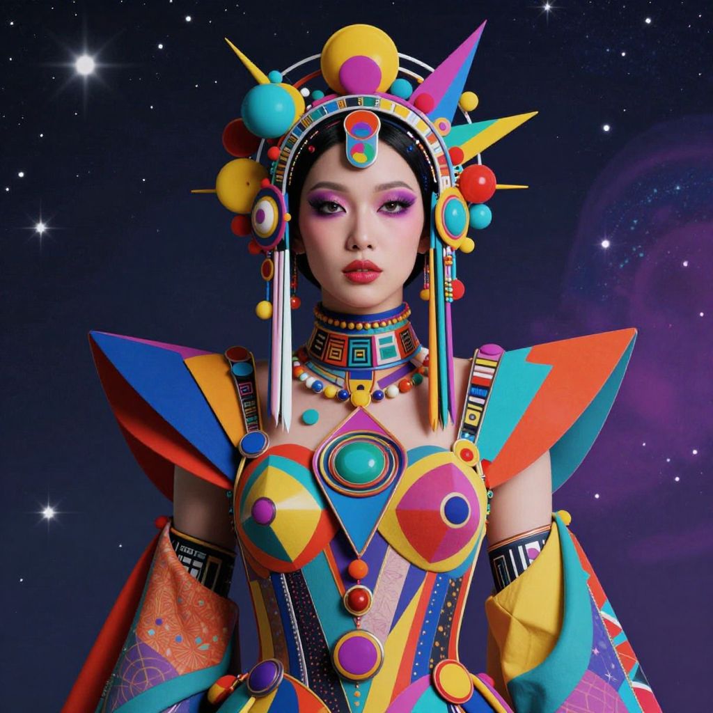 Digital art of an Asian woman in vibrant, colorful, futuristic space-themed costume with geometric patterns, multicolored spheres, and starry background.