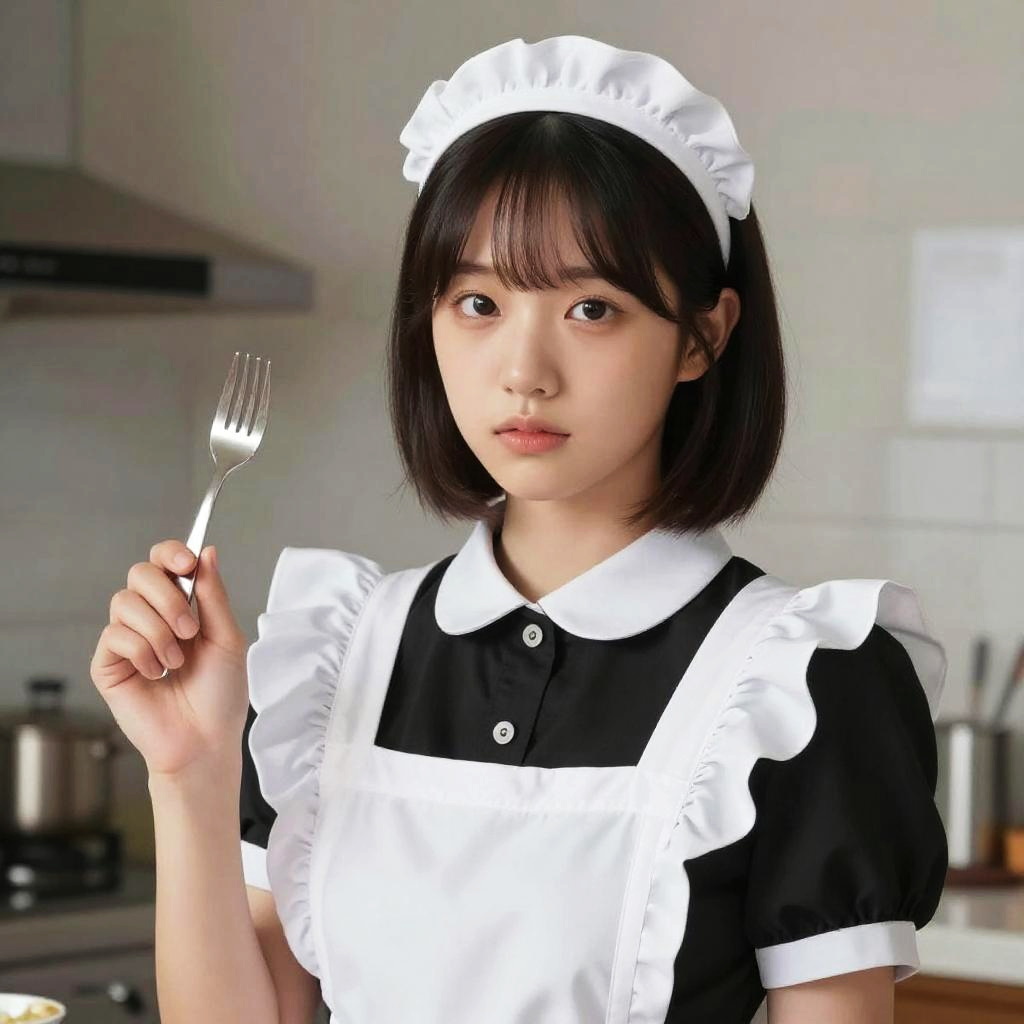 Photograph of an Asian woman with straight black hair in a white maid uniform, holding a fork, standing in a modern kitchen.