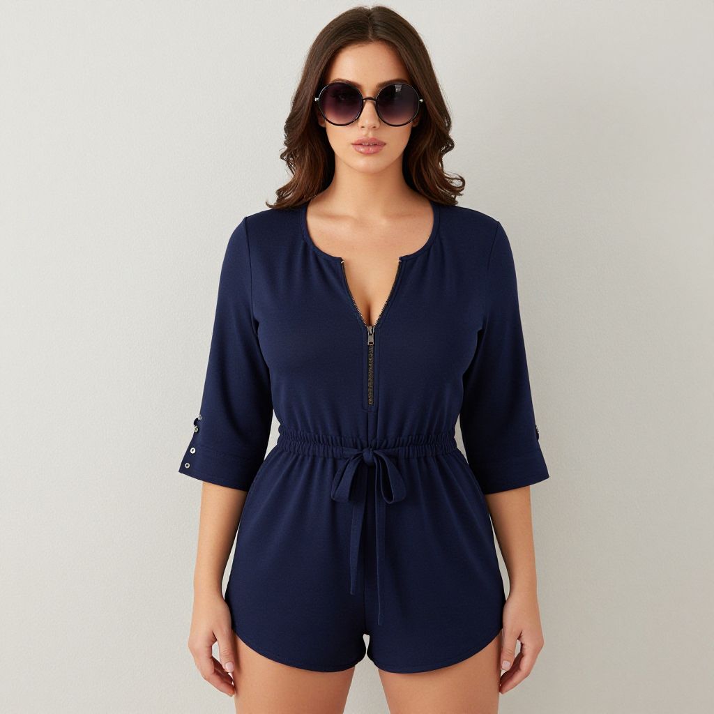 "Woman, casual, navy blue romper with a central zipper, three-quarter length sleeves with button tabs, elasticated waist with a tie belt, short-length hem, rounded neckline, wearing large round sunglasses with tinted lenses.. Sexy. Pretty face and beаutiful eyes. Big breasts."