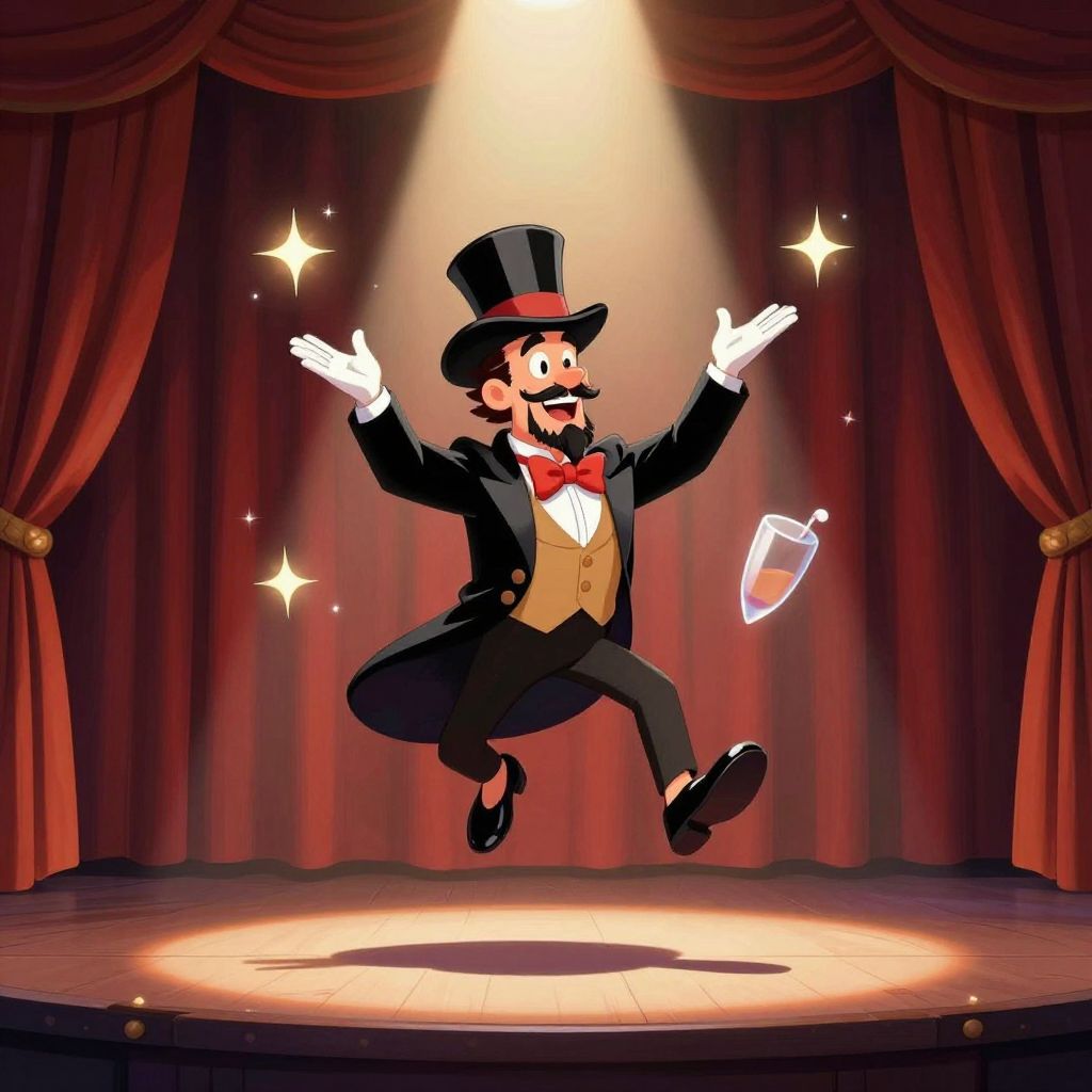 Cartoon character with a goatee, magician performing a levitation trick on stage, spotlight and sparkles, theatrical curtains in the background, rich colors with dynamic shading, stylized magical effects and whimsical details